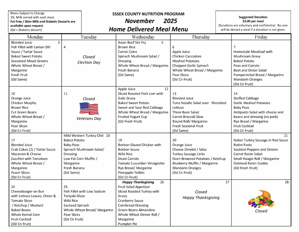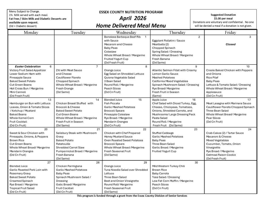 Our weekday hot meal delivery is provided to clients who are mostly homebound due to illness, physical limitation, advanced age, or inadequate cooking facilities. The meals are delivered usually between 10:00 a.m. and 2:00 p.m. to the client’s home by trained delivery drivers. Contact our mobile meals manager at (973) 744-0473 to learn about our meal plans and funding options.